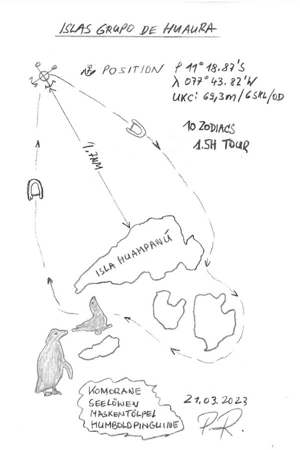 Sieben kleine, überwiegend unbewohnte Inseln im Pazifik – wir liegen vor den Huaura Inseln. Zehn Zodiacs sind im Wasser, insgesamt 155 Gäste sind draußen, beobachten Kormorane und Humboldt Pinguine und genießen die milde Seeluft.