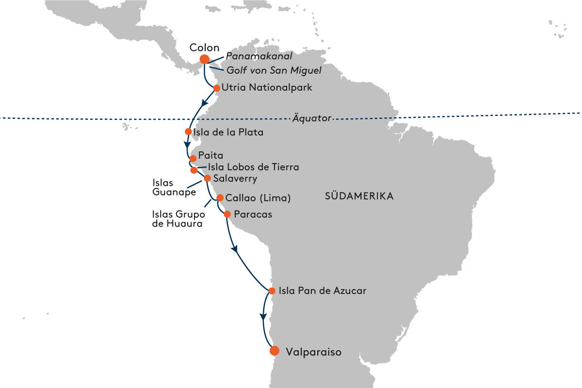 Die HANSEATIC inspiration befindet sich auf Kurs nach Puerto Bolívar. Es herrschen hervorragende Wetterbedingungen. Die Sonne scheint bei Temperaturen um 30 Grad, die See ist ruhig. Und wir beschließen, einen Bade Stop einzulegen. Bei Wassertemperaturen von 27 Grad und einer Wassertiefe von 1.364 Metern springen 153 Gäste in den Pazifik. Und sind begeistert!
