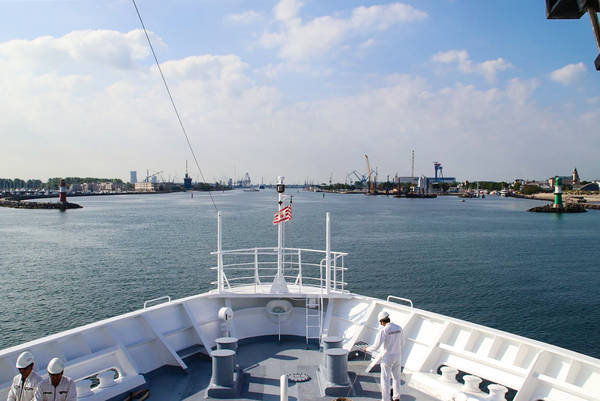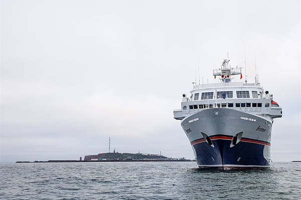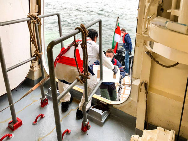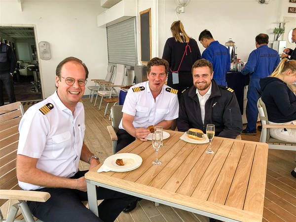 Es war die längste „Reise“, die die BREMEN an einem Stück je gemacht hat, an Bord nur noch 71 Crew-Mitglieder. Neben den zwei Stopps in den Schleusen gab es noch eine Unterbrechung: Vor Helgoland wurde ein Zodiac ausgesetzt, und Safety-Officer Jan-Friedrich Grünewald holte 120 Fischbrötchen und 142 Fischfrikadellen. Seine Eltern sind die Inhaber des „Helgoländer Fisch-Ecks“. Der Imbiss war ihr Gruß für die Seeleute nach langer Reise. Kapitän Dolf Jenckel und seine Crew freuen sich über den üppigen kulinarischen Gruß von der einzigen deutschen Hochseeinsel. Und der Kapitän ergänzt die vielen Angaben zur reibungslosen Fahrt um eine letzte Zahl: „Wir hatten auf der Reise überwiegend Glück mit dem Wetter, nur ein Sturmtief mussten wir ein wenig südlich umfahren.“