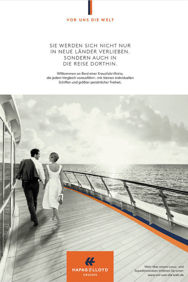 Hapag-Lloyd Cruises ist in den deutschsprachigen Märkten der führende Anbieter für Expeditions- und Luxuskreuzfahrten auf höchstem Niveau. Das werden wir wieder verstärkt deutlich machen. Claim und Design werden Ihnen daher nicht nur in Anzeigen, sondern auch in allen anderen Medien der Dachmarkenkommunikation begegnen. Nicht zuletzt soll der Claim auch nach innen wirken: als ständige Erinnerung daran, neue Routen, Wege und Möglichkeiten zu entdecken.