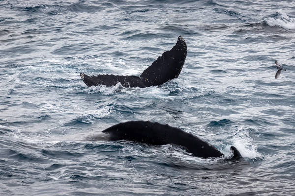 Nach der Umrundung wird die Reise fortgesetzt, und am Horizont zeigen sich die ersten großen Eisberge. Sie wirken wie ferne Grüße aus der Antarktis, in die unsere Reise führt. Gegen 14 Uhr entdecken wir von der Brücke aus eine Gruppe Wale, ihr Blas ist weit sichtbar. Kurzerhand wird die Geschwindigkeit verringert, der Kurs geändert, und nach ein paar Minuten liegen wir mit einigem Abstand zu den Tieren. Die Durchsage von der Brücke – „Waaaaaale!“ – ruft die Gäste auf die offenen Decks und Balkone, auf dem Nature Walk steht man nun Schulter an Schulter. Unzählige Fotos werden „geschossen“, die Begeisterung ist groß.