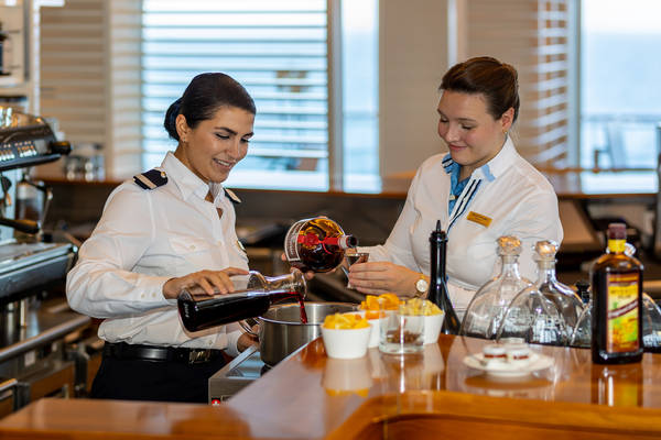 Ein exklusives Heißgetränk ist auch der Glühwein, den Corporate Executive Chef Timon Lohrengel für die festlichen Momente an Bord unserer Schiffe kreiert hat. Er ergänzt klassische Zutaten wie Zimt, Nelken, Sternanis, Kardamom und Ingwer um einen Schuss feiner Spirituosen – Myers's Rum und Grand Marnier – und fügt noch etwas Pfeffer hinzu. So entsteht ein eleganter, würzig-duftender Weihnachts-Drink. Johanna Krupka, Bar-Managerin der HANSEATIC inspiration, und Elaheh Alizadah, Maitre an Bord des Expeditionsschiff, haben den „Roten Chai-Pfeffer Glühwein“ zubereitet. Und sind ganz begeistert.
