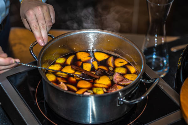 Alle Zutaten – mit Ausnahme der Spirituosen, da sie sonst verkochen würden – langsam aufkochen und zehn Minuten ziehen lassen. Zum Schluss die Spirituosen hinzufügen, mit etwas Zucker abschmecken, und durch ein Sieb in Becher oder hitzefeste Gläser gießen.