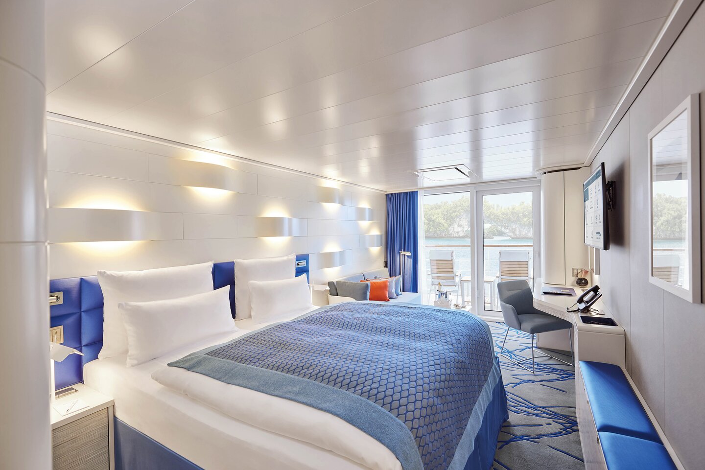 Die French Balcony Kabinen der Kategorie 3 auf Deck 6 sind ca. 23 m², die der Kategorie 5 auf Deck 7 ca. 21 m² groß. Die Balkonkabinen am Heck der Schiffe haben einen geringfügig abweichenden Grundriss.
