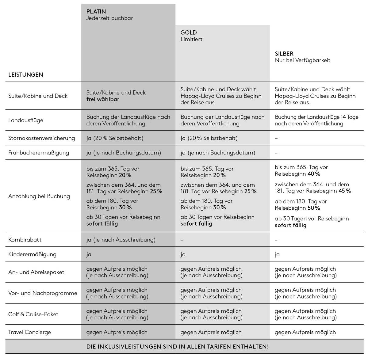 In den Tarifen PLATIN und GOLD ist die Stornokostenversicherung inkludiert (20 % Selbstbehalt). Weitere Informationen zur inkludierten Versicherung finden Sie auf unserer Website. Im SILBER-Tarif kann eine Stornokosten- und Reiseabbruchversicherung für alle Kunden aus der Europäischen Union und dem Europäischen Wirtschaftsraum optional hinzugebucht werden. Kunden aus der Schweiz mit Buchungen im SILBER-Tarif haben die Möglichkeit, über die ERGO Schweiz eine Stornokosten- und Reiseabbruchversicherung optional hinzuzubuchen. Für alle weiteren Länder kann von Hapag-Lloyd Cruises keine Stornokostenversicherung angeboten werden – Hapag-Lloyd Cruises empfiehlt den Abschluss einer Stornokostenversicherung direkt beim lokalen Reisebüro des Kunden.