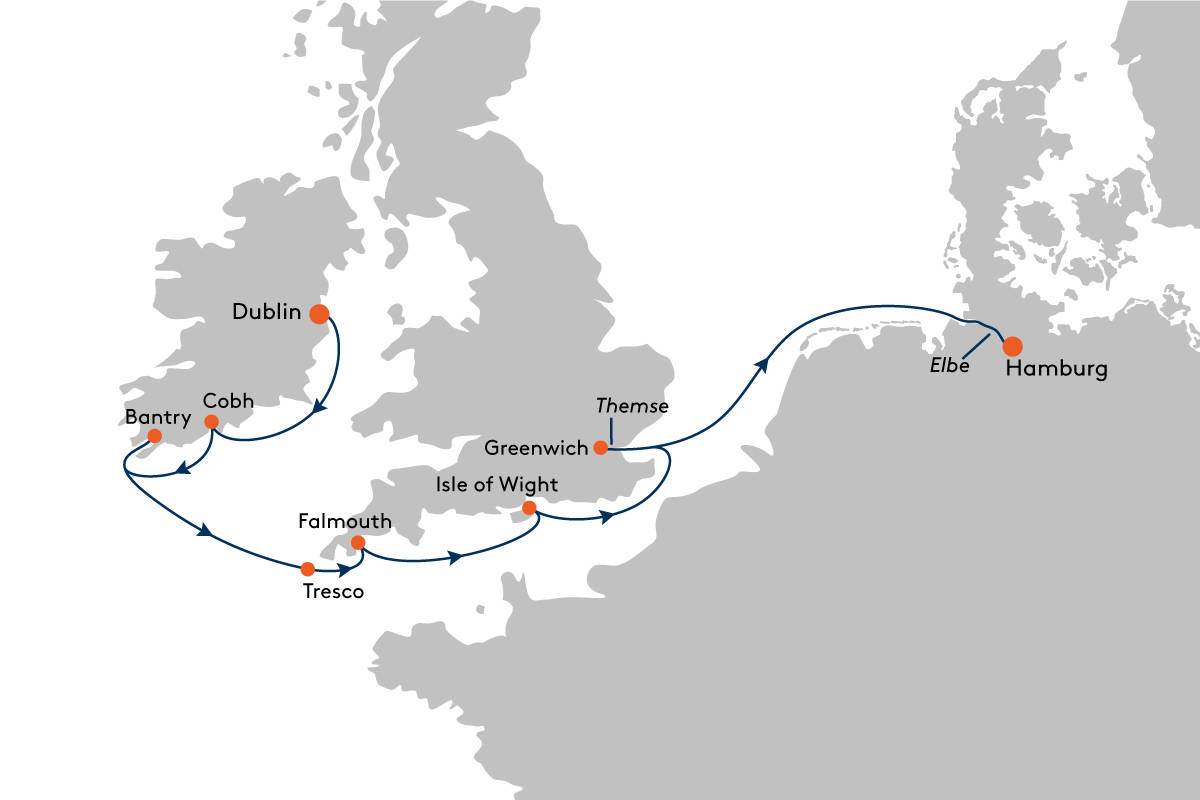 Entdecken Sie heute die lebhafte Hauptstadt Irlands mit historischen Bauwerken und faszinierenden Sehenswürdigkeiten. Die irische Nationalkathedrale St. Patrick´s ist bekannt für den bunten Mix an Monumenten und Statuen sowie einigen kuriosen Exponaten aus den letzten Jahrhunderten. Ein absolutes Highlight ist das schöne Trinity College mit seiner alten Bibliothek und dem spektakulären „Long Room“, der bis zu 200.000 wertvolle Bücher und das berühmte „Book of Kells“ beherbergt. Ein Abstecher in Dublins Kulturviertel Temple Bar mit bunten Pubs, kleinen Theaterbühnen, Ateliers und Geschäften darf nicht fehlen. Hier haben Sie Zeit für einen Bummel. Nach einem landestypischen Lunch in einem irischen Pub mit einem Glas Guinness erreichen Sie am Nachmittag die EUROPA.