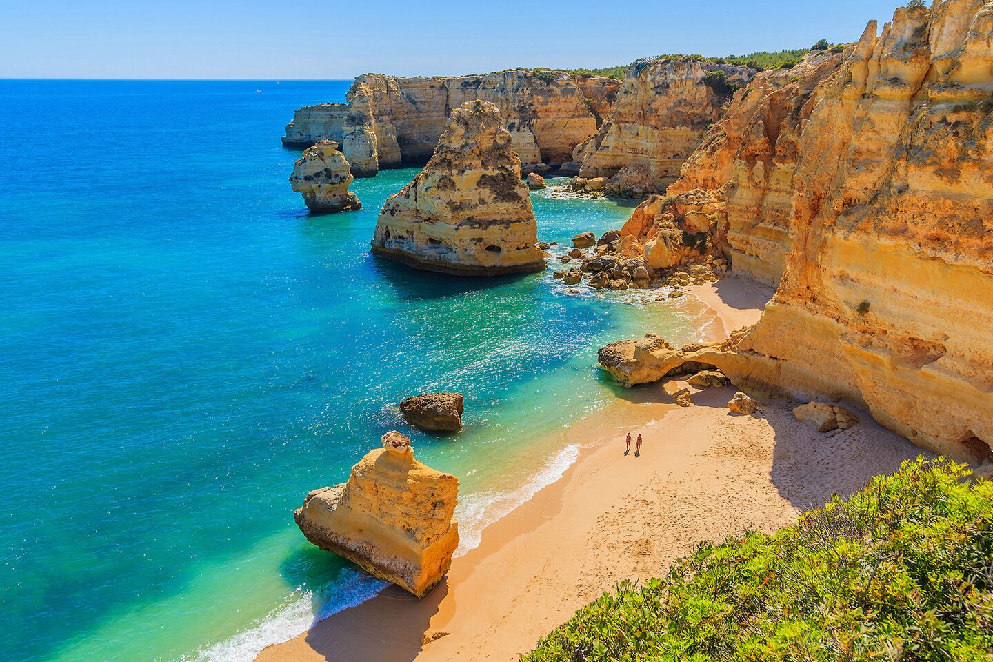 Die kupferroten Steilfelsen entlang der Küste der Algarve, die sich beinahe senkrecht aus dem tiefblauen Meer erheben, machen Portimao zu einem echten Highlight. Die charmante Altstadt und der Yachthafen locken zu entspannten Spaziergängen, während der Praia da Rocha – ein endloser, golden schimmernder Strand – zum Sonnenbaden und Genießen einlädt. Zahlreiche weitere Buchten, Düneninseln und kristallklares Wasser sind perfekt für individuelle Strandtage, die den Alltag schnell vergessen lassen.