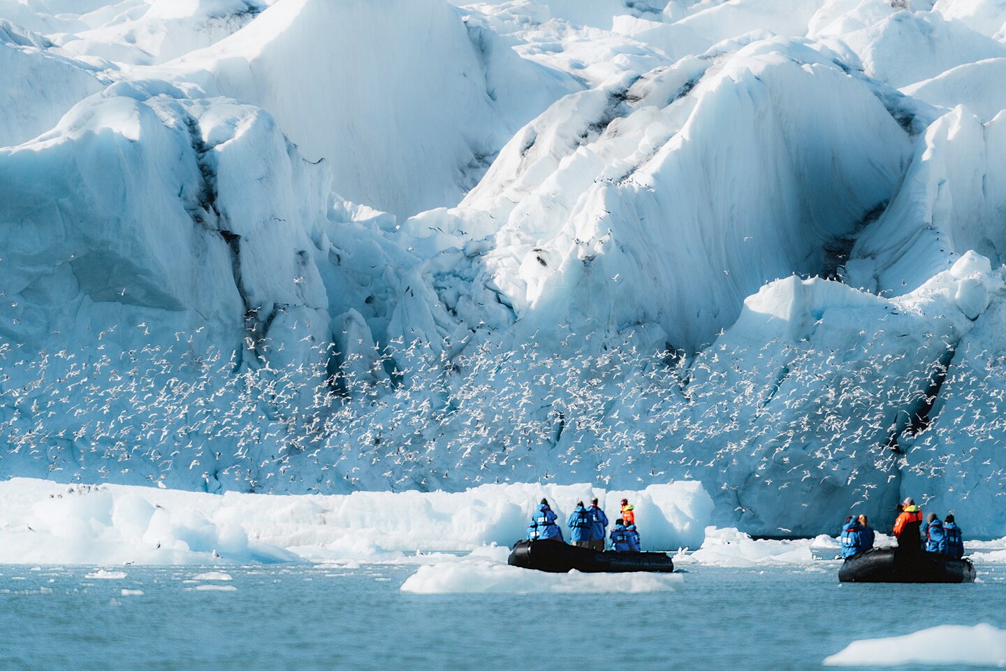 Geschichten der Geologie und Glaziologie offenbaren sich Ihnen im Labyrinth des Kaiser Franz Josef Fjords. Steil aufragende Felswände wechseln sich mit Gletscherzungen ab, von denen kleine und große Eisberge ins Meer driften.