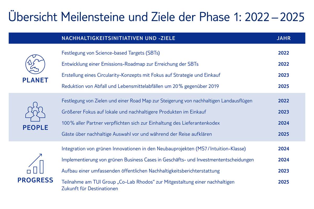 Bereits erfolgreich umgesetzt wurde die Festlegung der wissenschaftsbasierten Klimaziele, der sogenannten „Science Based Targets“. Dahinter steht die unabhängige Science Based Target Initiative (SBTi), getragen unter anderem von der Umweltorganisation WWF und dem UN Global Compact, einem weltweiten Pakt zwischen Unternehmen und der UN, um die Globalisierung sozialer und ökologischer zu gestalten. Mit der TUI Group haben wir unsere selbstgesteckten Ziele durch die SBTi in einem strengen Verifizierungsprozess überprüfen lassen und die Bestätigung erhalten, dass sie mit den neuesten Erkenntnissen der Klimawissenschaft übereinstimmen: Bis 2030 sollen die Emissionen der TUI Kreuzfahrtgesellschaften (TUI Cruises und Marella) insgesamt um 27,5 Prozent im Vergleich zu den Werten von 2019 reduziert werden. Diese verbindlichen und absoluten Ziele zur CO2-Reduktion sind bisher einmalig in der Kreuzfahrtbranche.