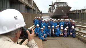 Der nächste Bauabschnitt der EUROPA 2 wird eingeläutet: Sehen Sie, wie das Trockendock geflutet und der Neubau zum ersten Mal zu Wasser gelassen wird.