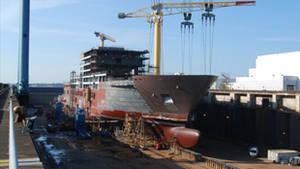Die EUROPA 2 nimmt weiter Form an. Schauen Sie sich hier im Trockendock und im Maschinenraum um und sehen Sie, wie weit der Bau fortgeschritten ist.