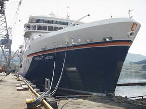 Nach zweiwöchigem Werftaufenthalt am Hamburger Werftstandort Blohm+Voss erfolgte die Flutung des Trockendocks. MS EUROPA hat wieder Wasser unterm Kiel. Die Instandsetzungs- sowie Wartungsarbeiten des kleinen Luxusschiffs aus der Flotte von Hapag-Lloyd Cruises wurden erfolgreich abgeschlossen. Modernisiert wurden 56 Suiten und der Fußboden im Europa Restaurant. Ab sofort steigert zudem ein neuer Unterwasseranstrich die Ökoeffizienz der EUROPA um bis zu 10 Prozent.